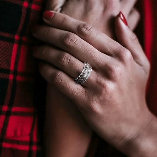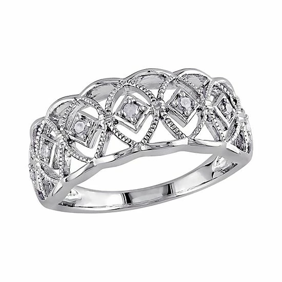Beautifully designed with round-cut diamonds surrounded by open-worked and miligrain detailing, this sterling silver ring exudes ornate appeal. Comes in a gift box.