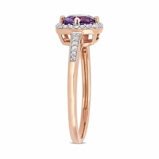 Elegantly appointed with a round-cut amethyst and scintillating diamonds, this 10k rose gold frame ring adds a touch of sophistication to your ensembles.