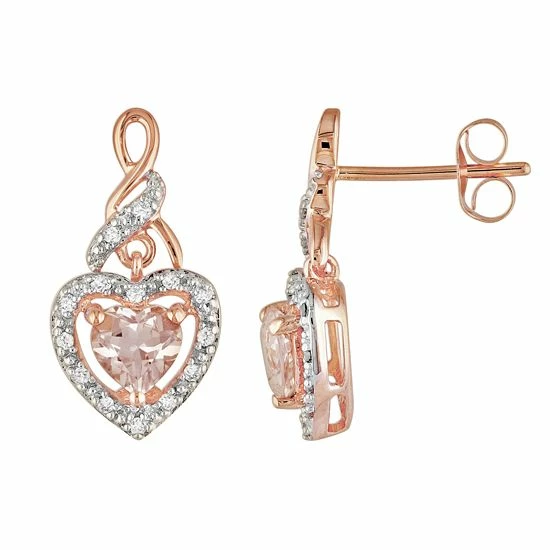 Heart-cut genuine morganite stones framed by diamonds give these drop earrings delicate beauty.