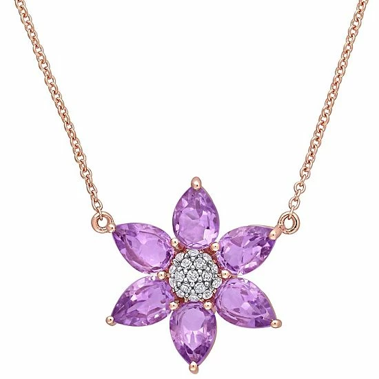 Adorned with amethyst gemstones and diamond accents arranged in a lovely flower motif, this 10k rose gold pendant is an eye-catching addition to your look.