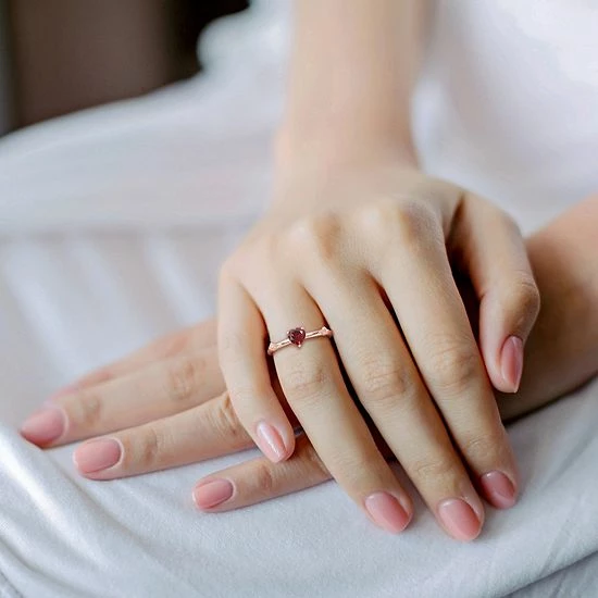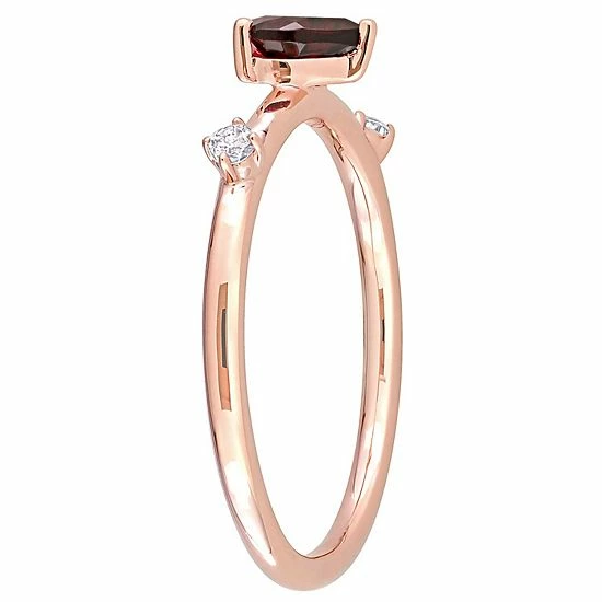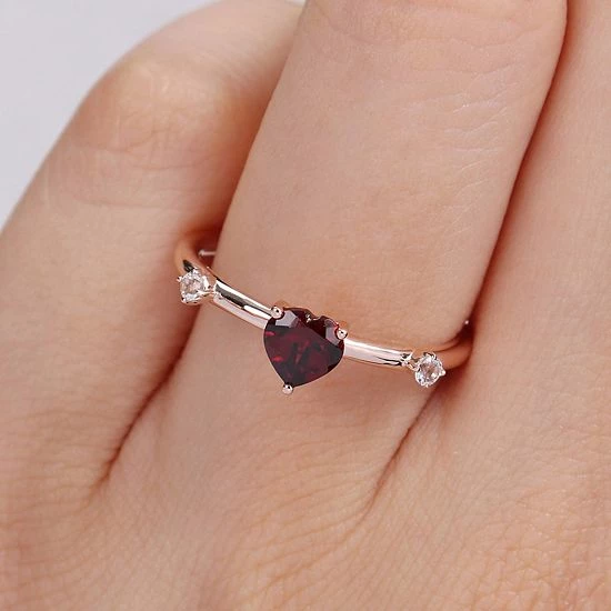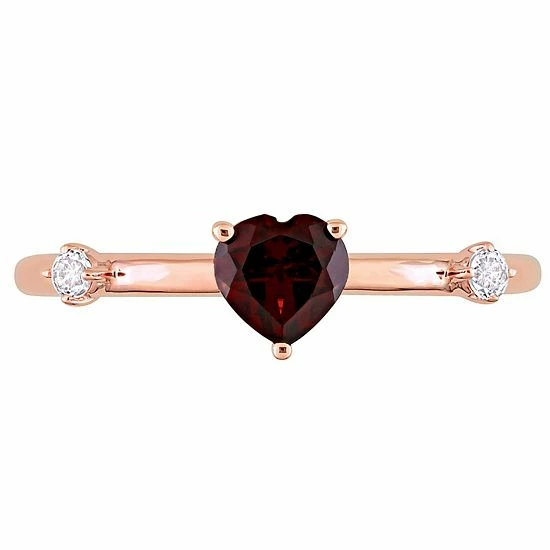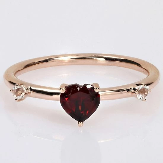 Featuring a single heart-cut garnet center stone accented on each side by a round-cut white topaz, this 10k rose gold Stella Grace stack ring is simply stunning.