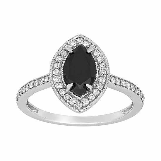 Featuring a marquise-cut black diamond center stone surrounded by white diamond accents, this sterling silver ring is captivating.