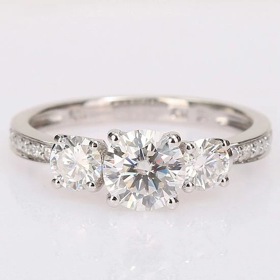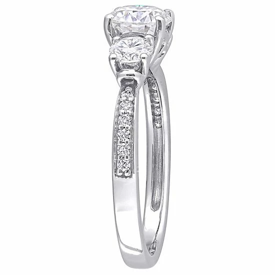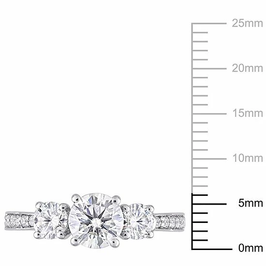 Beautifully adorned with a trio of round-cut, lab-created moissanite gemstones, this Stella Grace engagement ring is a stunning symbol of your love.