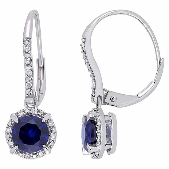 Featuring a pair of stunning lab-created sapphires and diamonds, these beautiful 10k white gold halo leverback earrings are the perfect way to finish any outfit.