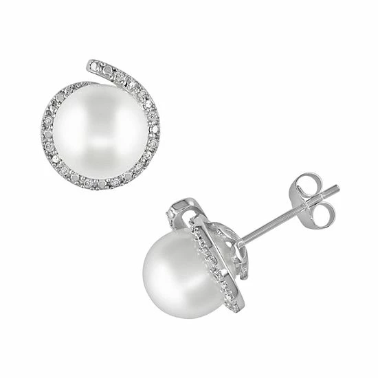 Freshwater cultured pearls framed by diamonds give these stud earrings exquisite beauty.