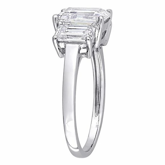 Adorned with a beautiful trio of emerald-cut, lab-created moissanite gemstones, this Stella Grace engagement ring is a breathtaking symbol of your love.