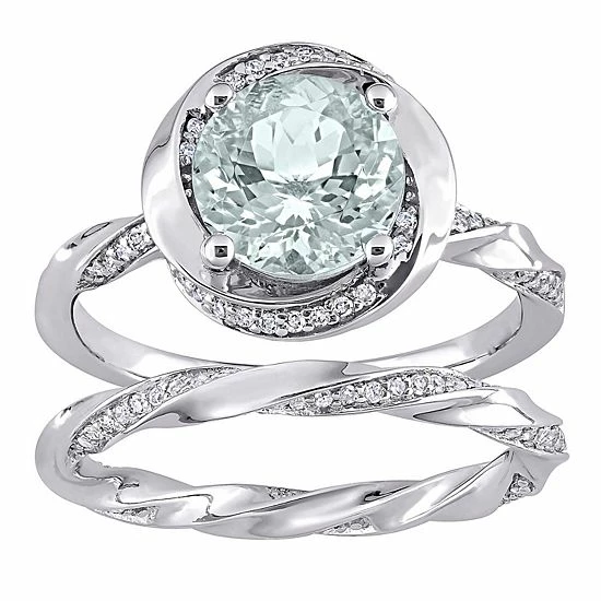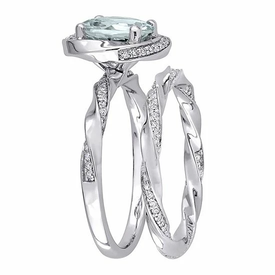 Profess your love in a beautiful way when you present her with this gorgeous aquamarine engagement ring set. Crafted from 14k white gold, and adorned with swirls of sparkling diamonds, it is sure to take her breath away.