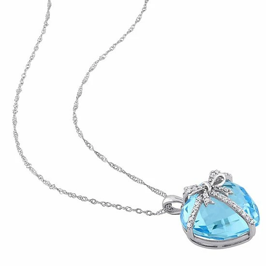 Featuring a beautiful blue topaz heart wrapped in a diamond-covered bow, this charming pendant makes a lovely gift.