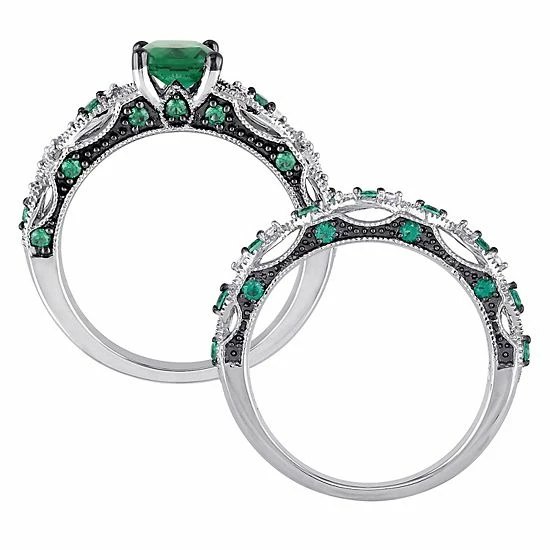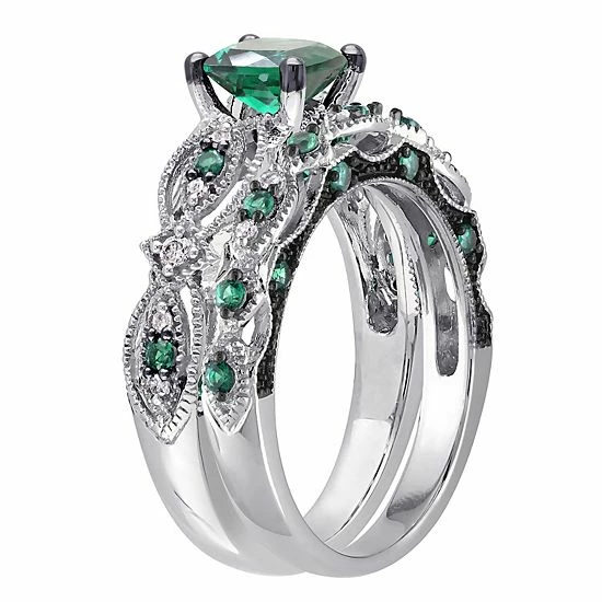 Featuring a vintage-inspired design decorated with lab-created emeralds and shimmering diamonds, this Stella Grace bridal set is a uniquely beautiful way to celebrate your love.