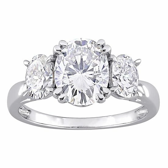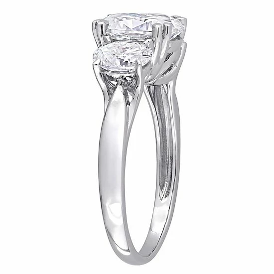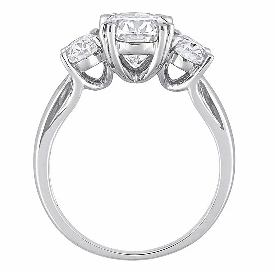 This stunning 10k white gold lab-created moissanite 3-stone engagement ring is the ideal way to promise your everlasting love and dedication.