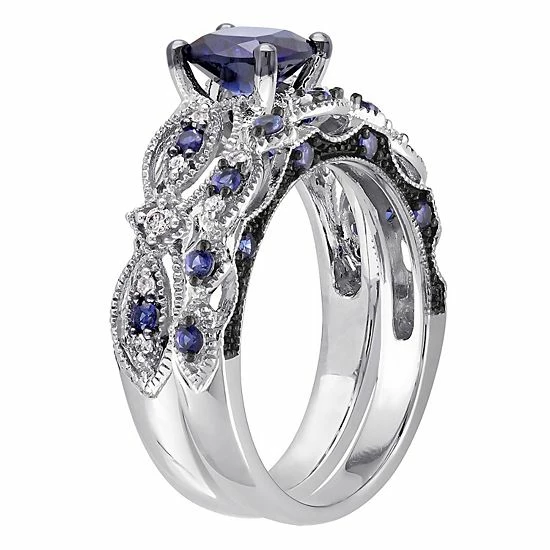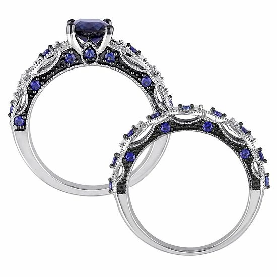 Featuring a vintage-inspired design decorated with lab-created sapphires and shimmering diamonds, this Stella Grace bridal set is a uniquely beautiful way to celebrate your love.