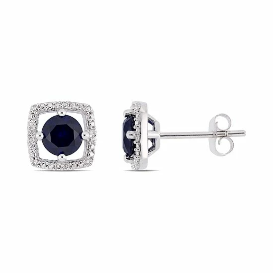 Featuring round-cut, lab-created sapphire center stones beautifully framed by diamond accents, these 10k white gold stud earrings are an elegant companion to your attire.
