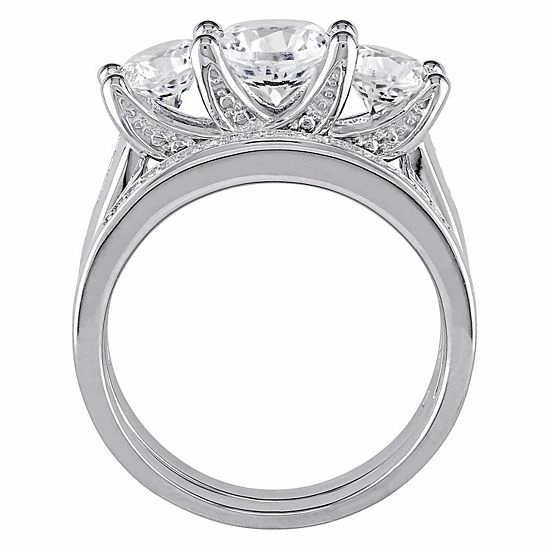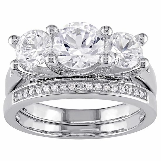 Adorned with round-cut diamonds situated in a 3-stone motif, this engagement ring set is simply stunning. A coordinating wedding band with pave-set diamond accents completes the captivating design.