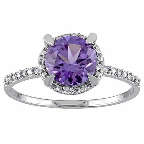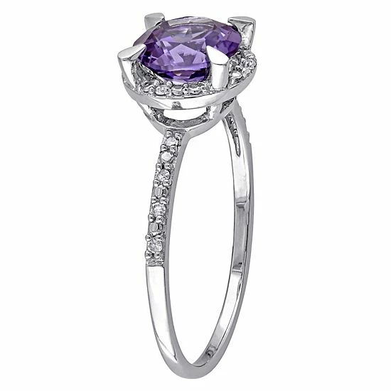 Featuring a captivating simulated alexandrite center stone accented by a halo of diamonds, this Stella Grace ring beautifully accents any ensemble.