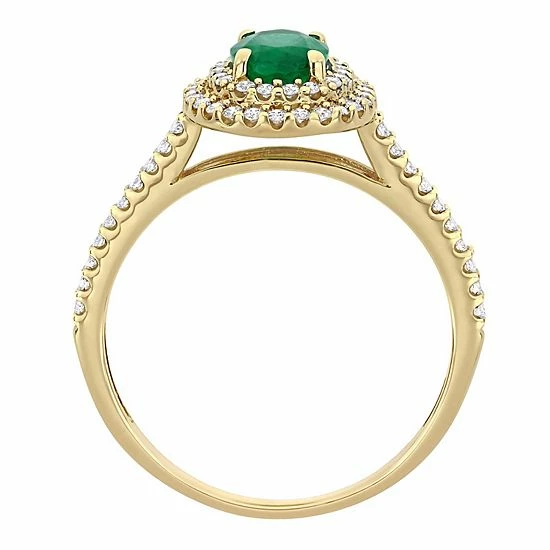 Featuring an oval-cut emerald center stone surrounded by diamonds, this Stella Grace ring offers a classically beautiful look she’ll love.