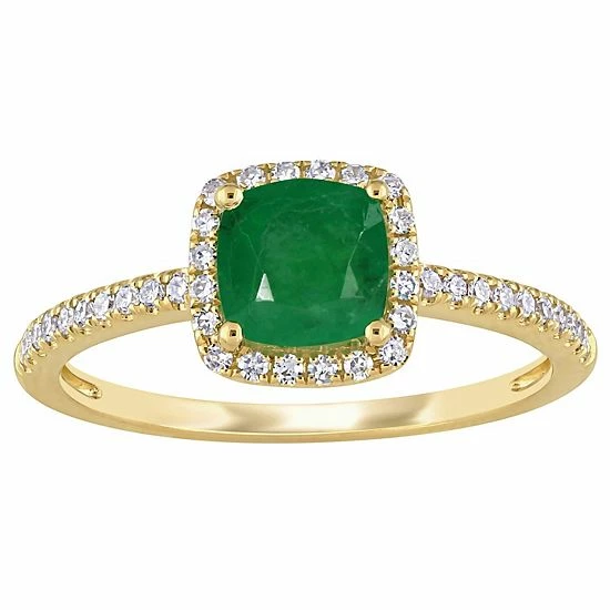 This alluring 14k gold Stella Grace ring features a beautiful cushion-cut emerald with a sparkling diamond halo and band for a lovely look.