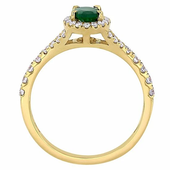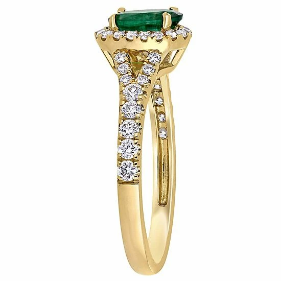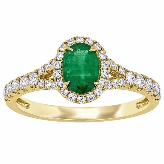 This alluring 14k gold Stella Grace ring features a beautiful oval-cut emerald with a sparkling diamond halo and split pave for a lovely look.