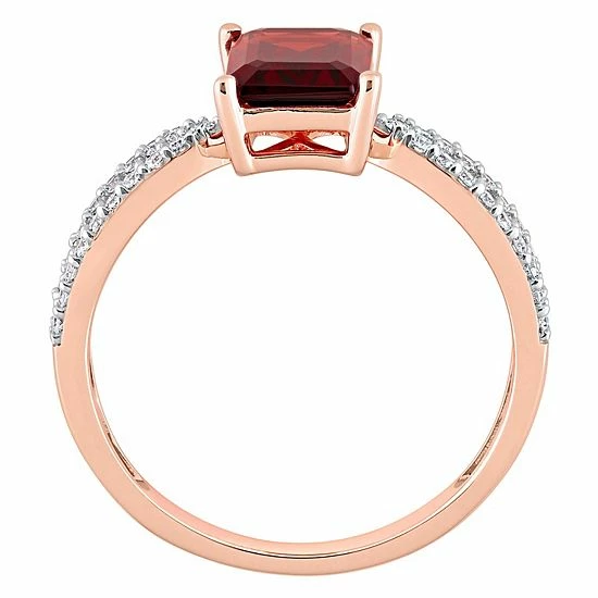 Featuring an emerald-cut garnet center stone accented with shimmering diamonds, this 14k rose gold Stella Grace engagement ring is a beautiful symbol of your love.