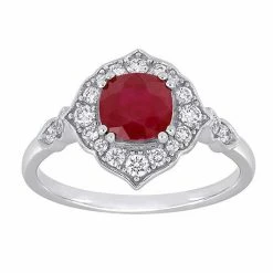 This alluring 14k white gold Stella Grace ring features a beautiful cushion-cut ruby and sparkling diamond halo and accents for a lovely look.