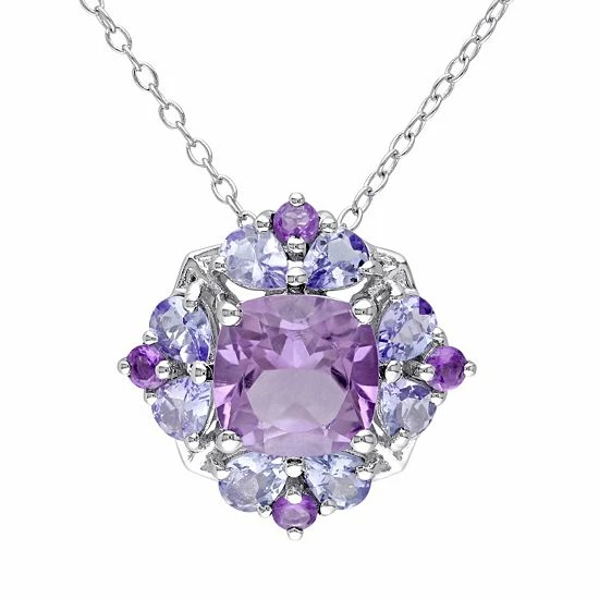 With a cushion-cut genuine amethyst center stone surrounded by round- and pear-cut genuine tanzanite and amethyst accents, this sterling silver flower necklace enhances your ensemble with vibrant appeal. Comes in a gift box.
