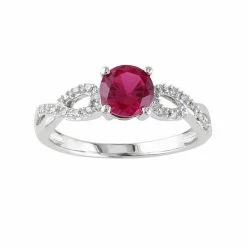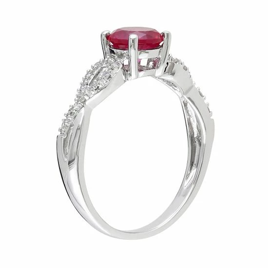 This 10k white gold engagement ring features a beautiful twist design with a lab-created ruby center stone and shimmering diamonds.