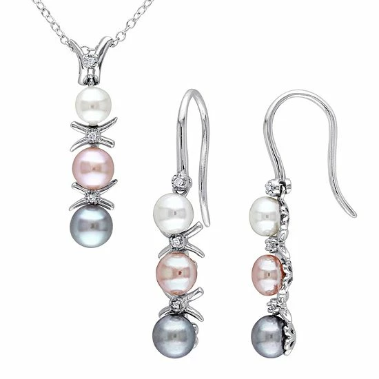 With three colors of freshwater cultured pearls, this Stella Grace drop necklace and earring set is accented with sparkling diamond accents for a look you’ll love.