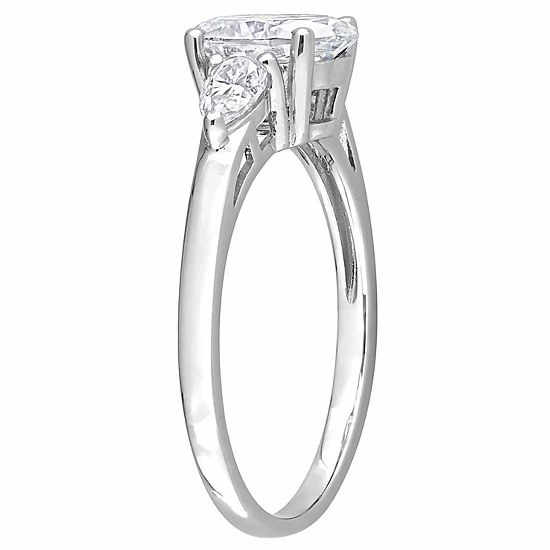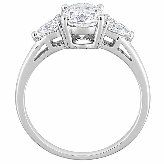 Adorned with beautiful, lab-created moissanite gemstones set in a three-stone motif, this Stella Grace engagement ring displays your love in a wondrous way.