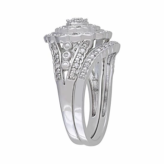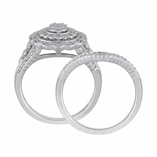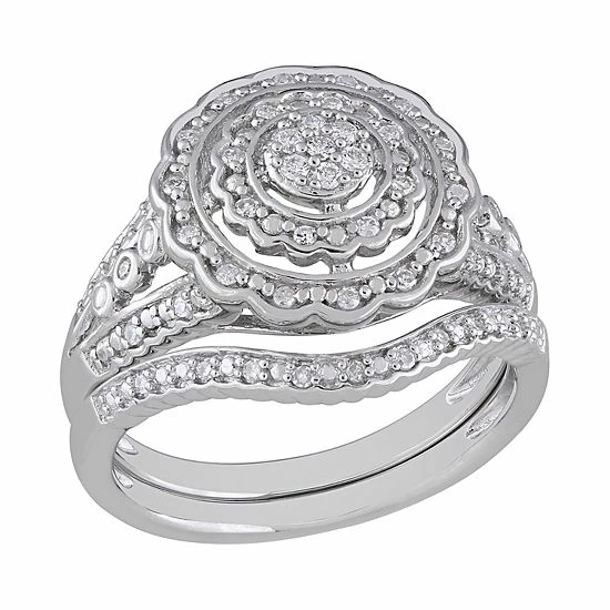 Featuring scintillating diamonds in a flower motif, this sterling silver bridal set is a lovely symbol of your commitment.