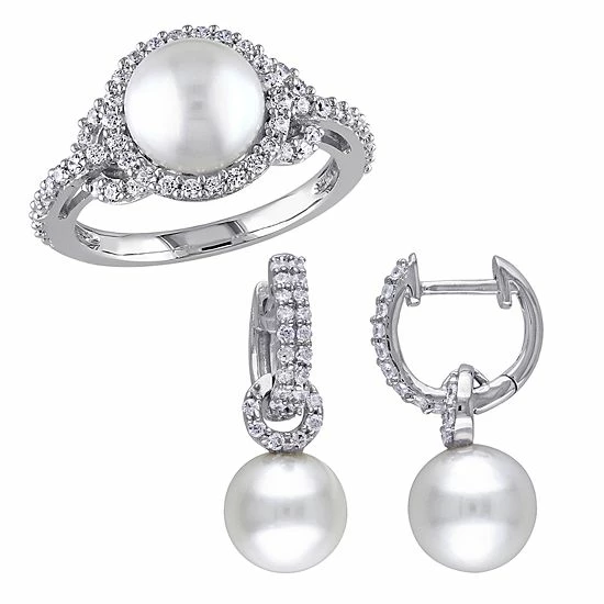 Decorated with lustrous freshwater cultured pearls and shimmering round-cut diamonds, this Stella Grace ring and earring set is an elegant addition to your wardrobe.