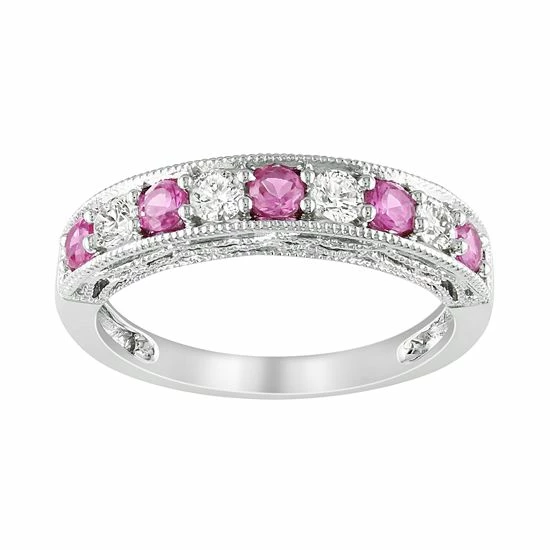 - Round-cut, lab-created pink and white sapphire stones offer a gorgeous glow.