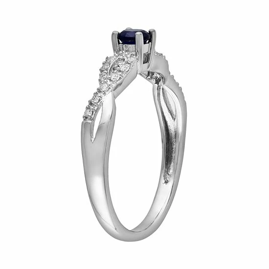 Endless elegance. A round-cut, lab-created sapphire center stone makes this infinity ring a beautiful way to ask for always. Pledge your love with this sterling silver ring.