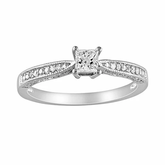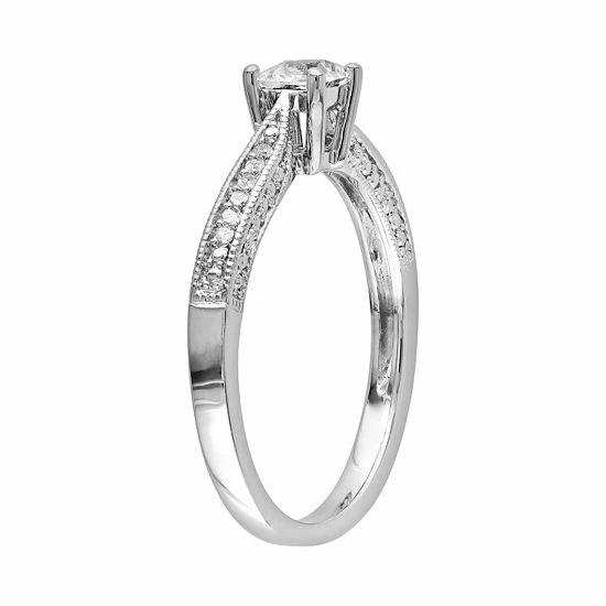A princess-cut, lab-created white sapphire stone and diamond accents give this sterling silver ring an icy glow.