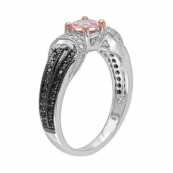 Featuring a round-cut morganite center stone accented with black and white diamonds, this split-shank ring adds a stylish finishing touch to your ensembles.