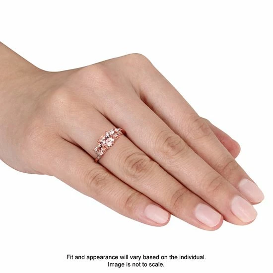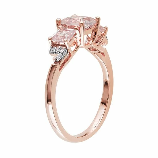 Adorned with cushion-cut genuine morganite stones and diamond accents, this three-stone ring is altogether captivating.