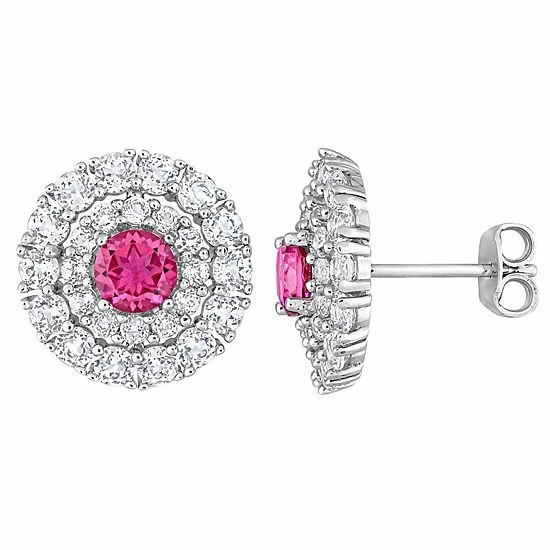 Featuring a pink topaz center stone beautifully accented by halos of dazzling white topaz gemstones, these Stella Grace stud earrings accent your attire beautifully.