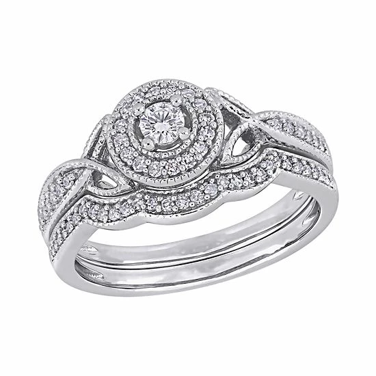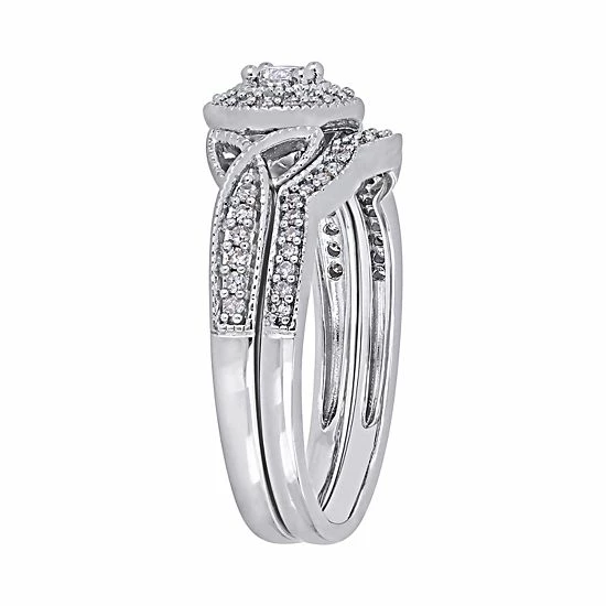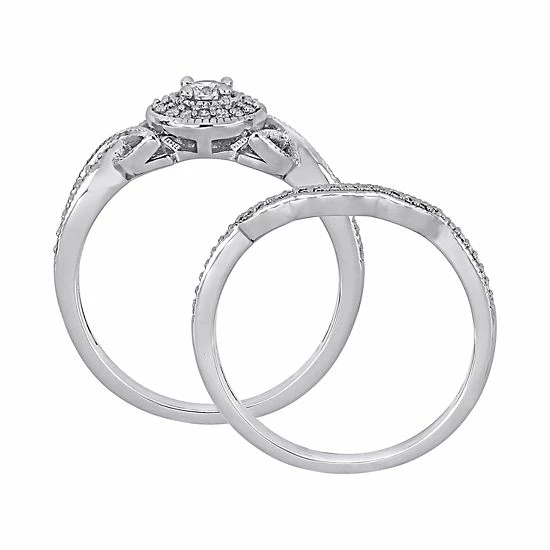 A captivating symbol of your unconditional love and commitment, this Stella Grace engagement ring set is bound to be cherished for a lifetime. Accentuated with an array of illuminating diamonds, this sterling silver bridal set is altogether beautiful.