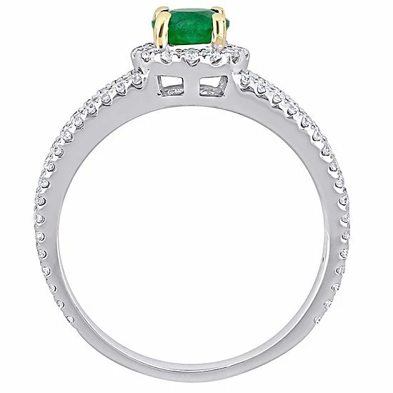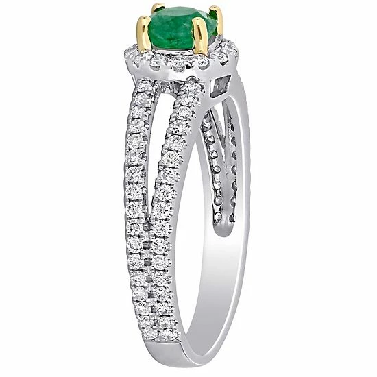 A round-cut emerald center stone and scintillating diamond accents give this Stella Grace engagement ring an unforgettable look you’ll love.